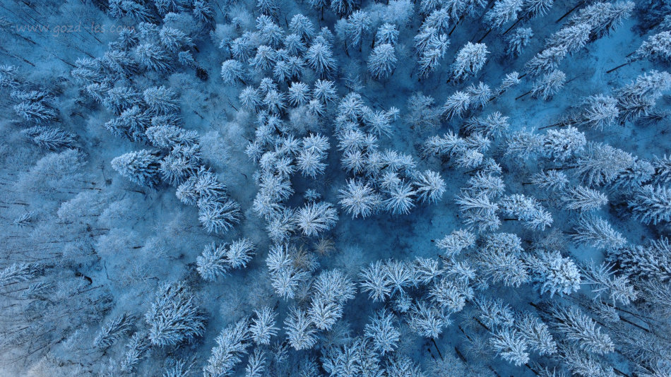Zasneženi gozd nam slika drugačno sliko, kot smo jo navajeni, pogled iz zraka pa je še bistveno drugačen. Nenadoma se nam odkrijejo različni vzorci, ki jih tvorijo krošnje dreves, gozdne poti, studenčki in potoki. Svoje doda tudi igra svetlobe.